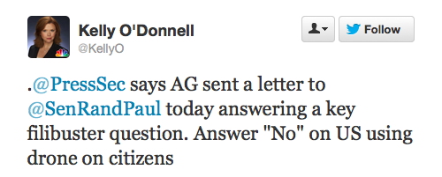 Reading directly from Holder’s letter to Paul, Carney said, “Does the President have the authority to use a weaponized drone to kill an American not engaged in combat on American soil? The answer is no.”