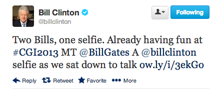 While chatting with Bill Gates at the Clinton Global Initiative’s 2013 Annual Meeting, former President and professional Democrat-whisperer Bill Clinton snapped a selfie and retweeted it, declaring, “2 Bills, one selfie.” (Gates, slightly more tech-savvy, appears to have tweeted it first.)
