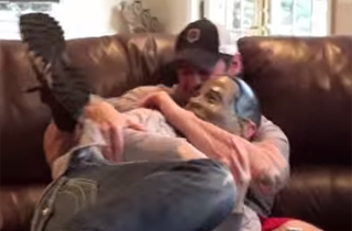 However, when the fake “Obama” debuted a new military salute that included a dance move, Heben leaped across the couch and placed the masked man in a chokehold.