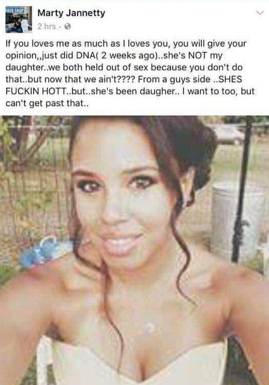 However, he wanted to know that “now that we ain’t” related, if it was OK because “from a guy’s side …SHE’s FUCKIN HOTT.” But, you know, she’s been his daughter, and while he wants to, he “can’t get past that.”