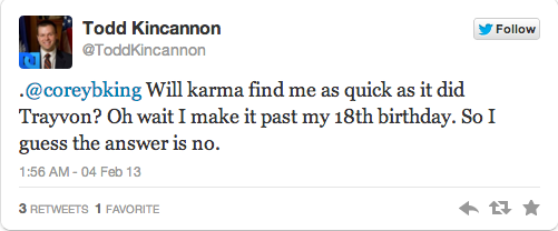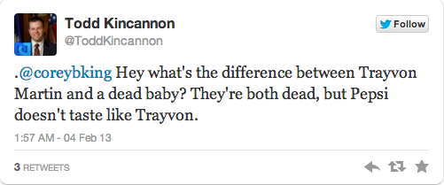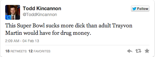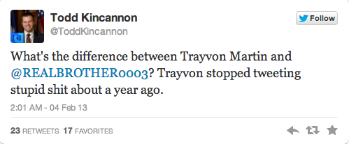 Kincannon’s tweets largely involved “jokes” about Trayvon Martin, dick-sucking, Hurricane Katrina, and black people.