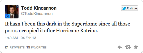 And, given the mid-game blackout, Kincannon took the opportunity to make a “joke” about the arena and its use as shelter for the “poors” among New Orleans’ majority black population during Hurricane Katrina: