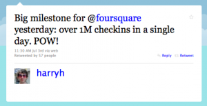 “Big milestone for @foursquare yesterday: over 1M checkins in a single day. POW!” tweeted Foursquare Engineering Lead Harry Heymann on Saturday. Heymann confirmed to me that the million-checkin milestone was repeated on Saturday as well. (No word yet on yesterday’s data for the actual 4th of July, or whether that data may have been affected by a collective food coma.)