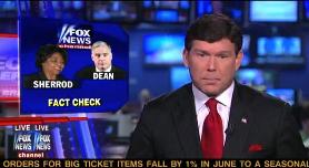 In a “fact check” segment on Special Report last night, Baier responded to what Dean said on MSNBC’s The Ed Show by visually displaying what we’ve been saying for a week – the out-of-context clip didn’t air on Fox News until Bill O’Reilly‘s 8pmET show. “Not a single frame of that video hit the air all day,” he said, while the entire day’s programming played in fast forward.