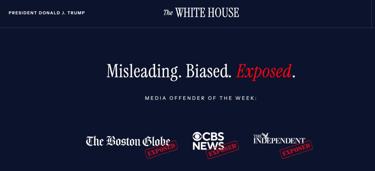 The page greets visitors with the banner: “Misleading. Biased. Exposed.” It then singles out the Boston Globe, CBS News, and The Independent as “media offenders of the week,” alleging the outlets misrepresented Trump’s response after Democrats released a video urging service members not to follow “illegal orders.”