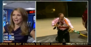 The video shows Fox News’ Jeff Flock demonstrating the power of the wind tunnel in General Motors (sweet, sweet General Motors) on, first, a car (a sweet, sweet, new Chevy Cruze) and then on himself. The wind is so powerful that it knocks Flock down and the battery right out of his microphone. Fortunately, Flock is a veteran of many a hurricane report so he manages to get back on his feet soon enough. Still…dude getting hit with wind equals funny. Also, can we please make that smoke wand thing part of the rhythmic gymnastics section of the Olympics? It’s so much cooler than ribbon dancing.