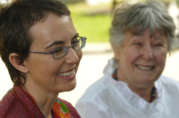 Both pictures show the congresswoman outside. In one she is alone and smiling at the camera, her hair trimmed short with the skin on the side of her head slightly disclored but with no clear sign of any scarring. In the other, she is sitting with a woman.