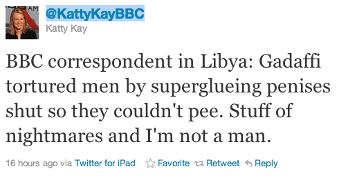 Who knew? Who thought it possible that your day could be ruined by a simple tweet? Well, that’s what happened for anyone following BBC World News America anchor Katty Kay who, yesterday, tweeted a report of a specialized torture technique employed by Muammar Gaddafi during his decades-long rule of Libya. Kay described the technique as the “stuff of nightmares” and…yeah. That’s a pretty good description.