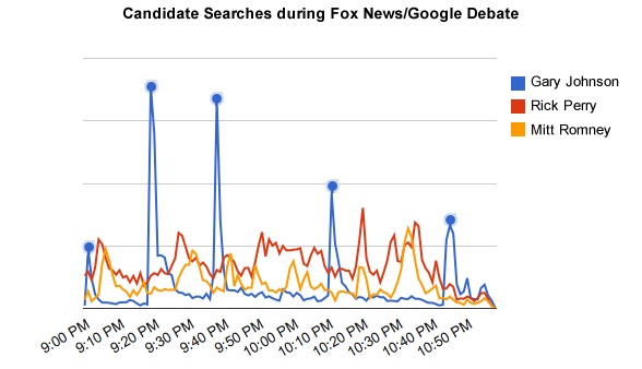 Aside from stealing Rush Limbaugh‘s joke, and stealing the show, former New Mexico Gov. Gary Johnson also stole Google users’ hearts during Thursday night’s Fox News/Google Republican Presidential Debate. Until now an under-the-radar joke, the libertarian-leaning GOP hopeful made the most of his infrequent airtime during the debate, and his crowd-pleasing answers (plus his borrowed line of the night) seem to have connected with debate viewers, according to search data released by Google.