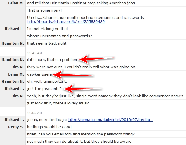 Our user databases do indeed appear to have been compromised. The passwords were encrypted. But simple ones may be vulnerable to a brute-force attack. You should change the password on Gawker (GED/commenting system) and on any other sites on which you’ve used the same passwords. Out of an abundance of caution, you should also change your company email password and any passwords that may have appeared in your email messages.