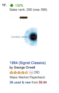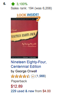 In the past 24 hours, the centennial edition of Orwell’s 1984 has shot up a staggering 3,100% in Amazon.com customer popularity, moving from #6,208 to #194 on the website’s best sellers ranking.