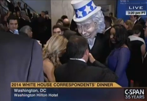 The gigantic head of Uncle Sam was seen amidst the gaggle of reporters and celebrities on the White House Correspondents Dinner red carpet today. Yes. Really.