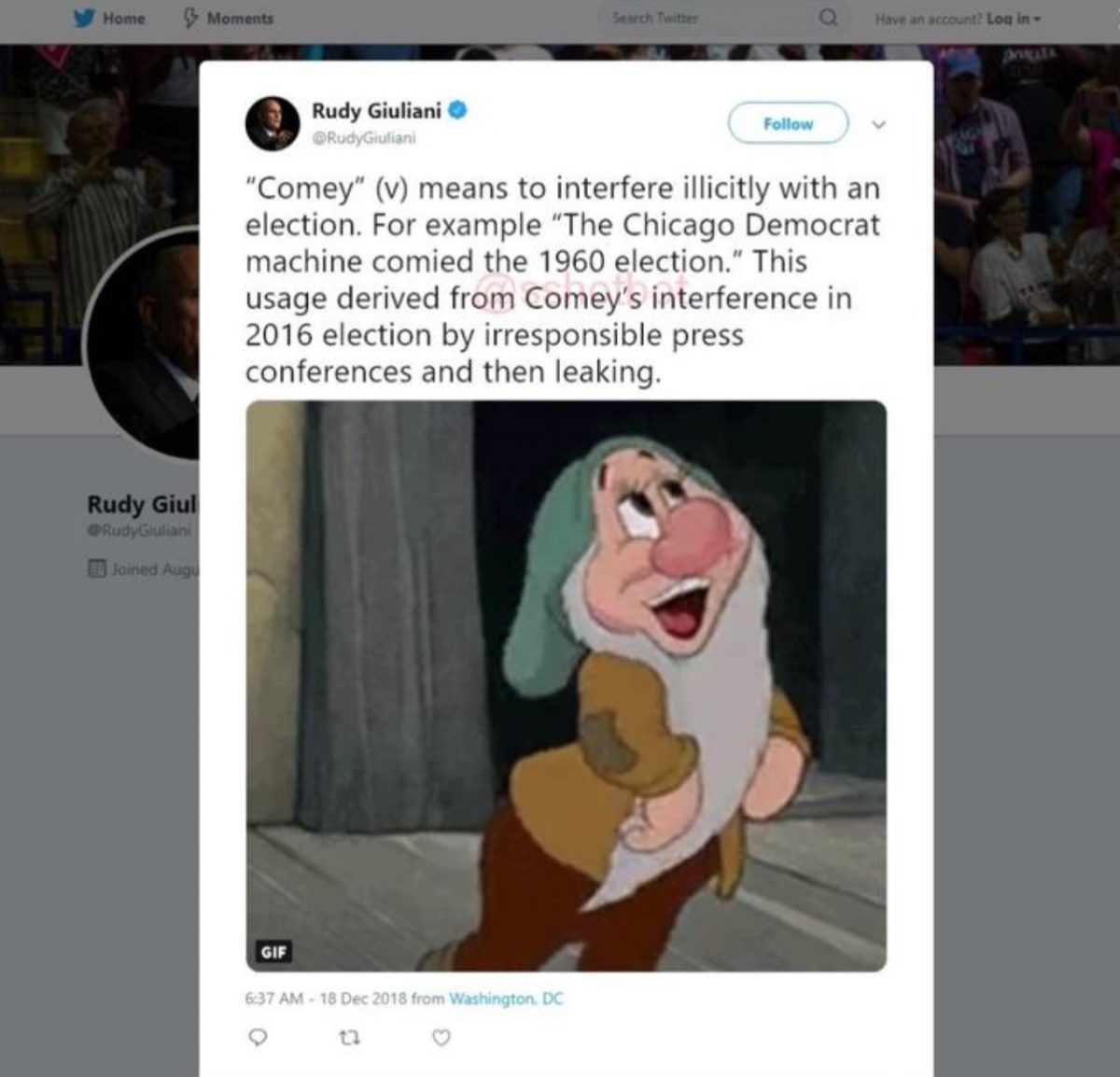 The Former New York City mayor-turned-Trump attorney got on Twitter to post a GIF from the Disney classic, Snow White and the Seven Dwarfs. It isn’t clear what exactly the meme portrayed, but Giuliani also included a response to Comey after the former FBI director blasted Republicans for doing nothing while Trump sneers at truth and the rule of law.