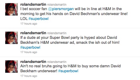 “If a dude at your Super Bowl party is hyped about David Beckham’s H&M underwear ad,” Martin Tweeted, “smack the ish out of him!”