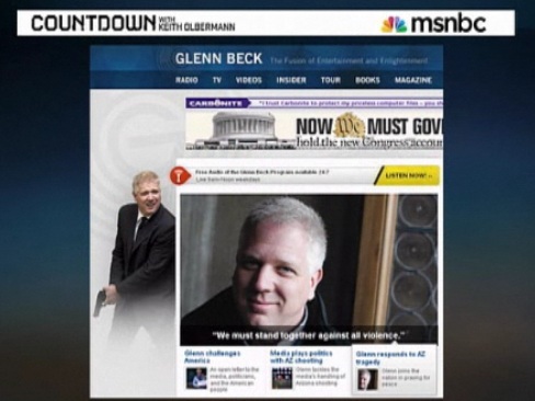 On Monday night’s Countdown, host Keith Olbermann highlighted a screenshot from Glenn Beck‘s website that featured an unfortunate juxtaposition: a photo depicting Beck saying “We must stand together against all violence,” and on the left sidebar, a picture of Beck holding a semiautomatic pistol. The image, first captured by Media Matters‘ Angelo “StopBeck” Carusone, has since been taken down out of “respect” for the events of this weekend, according to former Mediaite-ite Glynnis MacNicol.