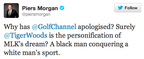 However, the Golf Channel got support from at least one corner: CNN’s Piers Morgan, who tweeted out a Tiger Woods reference and ended up scuffling with Twitchy over what he said. Morgan defended the Golf Channel’s tweet, again citing Tiger Woods.