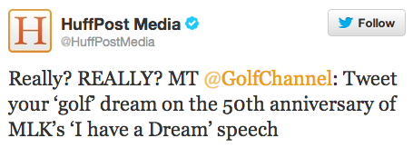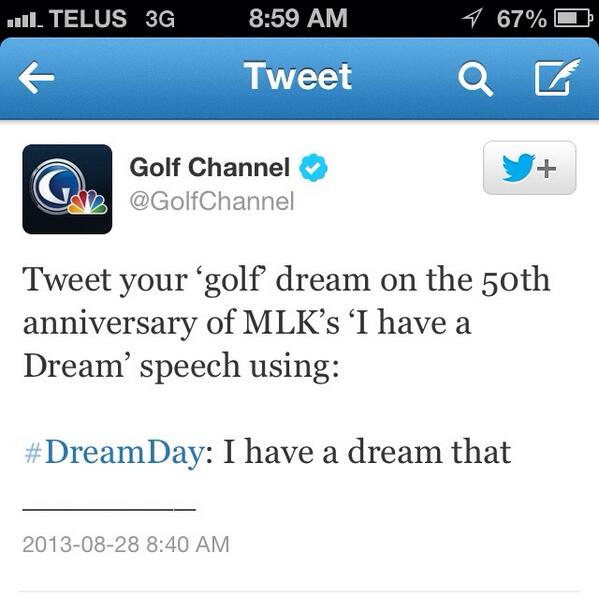 Today, the 50th anniversary of the March on Washington, is a day for everyone to reflect on that critical moment in American history and talk about how far the U.S. has come since then. For the Golf Channel, it was an opportunity to ask what people’s “golf dream” is. The channel’s Twitter handle asked its followers to share their golf dreams on his historic anniversary, leading to a round of social media mockery and condemnation.