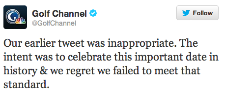 The Golf Channel deleted the tweet (more on that below) but it was preserved for posterity in this screencap posted on the blog UnMarketing.