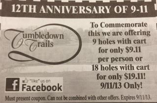 Tomorrow marks the twelfth anniversary of the September 11 terrorist attacks, which means it’s also the time of year when people get angry at other people for not being sufficiently reverent about the occasion. This year, a Wisconsin golf course called Tumbledown Trails has incurred the wrath of social mediaites everywhere with a coupon promotion commemorating the anniversary, a promotion that they’re actually running for the third time this year.