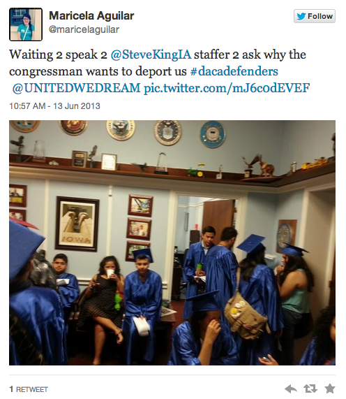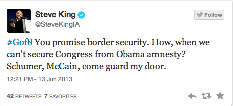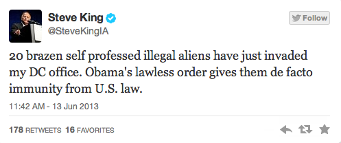 As DREAMers descend upon Capitol Hill this week to lobby politicians over the so-called “Gang of Eight” immigration reform bill, Rep. Steve King (R-IA) tweeted out several remarks about how “illegal aliens” have “invaded” his D.C. offices, and Obama’s “lawless” executive order gives them immunity from the guarding of his doors.