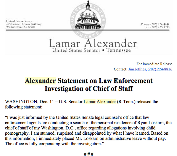 According to a press release, Sen. Lamar Alexander‘s (R-TN) chief of staff Ryan Loskam has been put on leave amidst allegations involving child pornography.