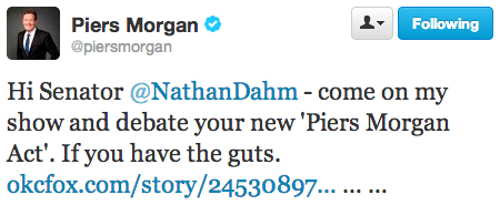 Anyone with a passing familiarity of CNN’s Piers Morgan knows he is quite possibly the biggest gun control advocate on cable news today, so it’s no accident a Republican state senator in Oklahoma is pushing a bill to relax gun restrictions under the name “Piers Morgan Constitutional Right to Keep and Bear Arms Without Infringement Act.” If that isn’t some pretty big political trolling, I don’t know what is.