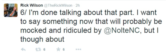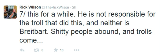 Wilson later took the tweets down and conceded that Breitbart’s John Nolte wasn’t responsible for his trollish readers: