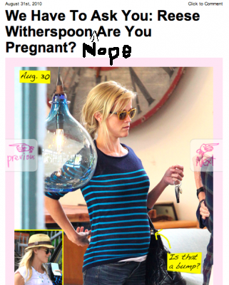 When it comes to the celebrity gossip machine, few stories can catch fire like Hollywood pregnancy rumors. That’s why the blog Hollywood Life’s front page currently features a headline screaming, “Are They Pregnant?” along with pictures of Reese Witherspoon and Jennifer Garner sporting what maybe possibly sorta could somewhat be construed as looking the tiniest bit like baby bumps.