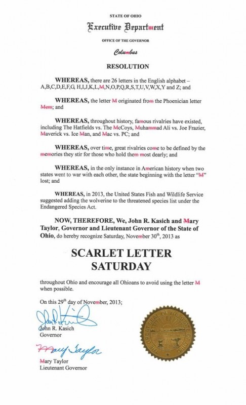 Kasich and Lieutenant Governor Mary Taylor issued an executive resolution making November 30th “Scarlet Letter Saturday,” and crossed out the “M” throughout the declaration, including in Mary Taylor’s signature: