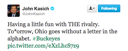 Governor John Kasich (R-OH) took the Ohio State University-Michigan college football rivalry to a whole new level on Friday, eliminating the letter “M” from the alphabet for the day of the game: