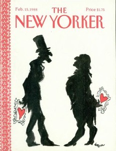 A beautifully-designed Valentine’s Day cover used to be an annual event for many magazines. Today, with the exception of an occasional women’s service mag, Valentine’s Day has almost disappeared from the newsstands. Thank goodness for the New Yorker, which has done an annual Valentine’s Day cover for over 70 years. And best of all, their covers keep getting better. We’ve collected 20 of the greatest New Yorker Valentine’s Day covers. Co-produced by Linda Rubes. For the full list of 20 covers, visit here. (Cover at left: February 12, 1990, illustration by Arnie Levin.)