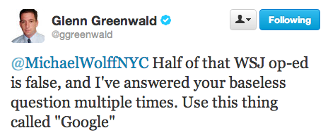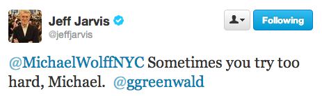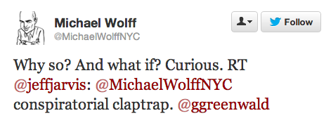 It began when Jarvis tweeted out links to Greenwald’s Skype appearance at Friday night’s Socialism 2013 conference. Wolff responded to Jarvis, calling Greenwald’s points “silly” and “blather.” Around the same time, Wolff was flogging the WSJ op-ed in a number of tweets, leading to this exchange with Jarvis.