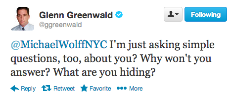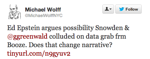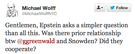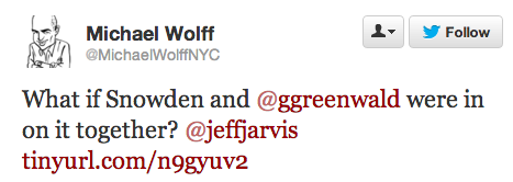 In the past few days, the media coverage of the ongoing NSA leaks story has now roped in Guardian reporter Glenn Greenwald, from profiles on his character to public calls he should be arrested. A new Wall Street Journal column engages in some wild speculation over whether Greenwald was actively involved in helping Edward Snowden “steal state secrets.” Vanity Fair contributing editor Michael Wolff tweeted out the link a number of times, and ended up in a Twitter war over responsibility and journalistic integrity with Greenwald and Jeff Jarvis.