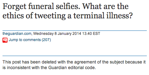 “Forget funeral selfies,” read the headline of Emma Keller’s Guardian column last Wednesday about Lisa Adams, who has meticulously detailed her treatment for stage 4 breast cancer in over 100,000 tweets. “What are the ethics of tweeting a terminal illness?”