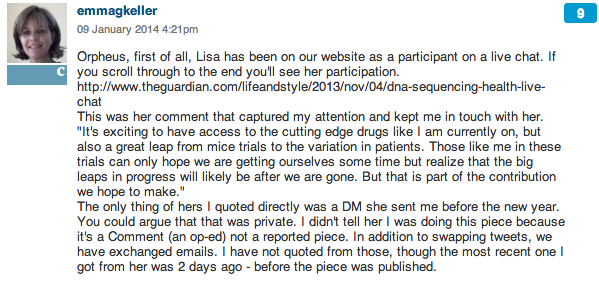 The comments section of the piece is still up, and there Keller can be seen defending both the piece itself and her use of one of Adams’ direct messages: