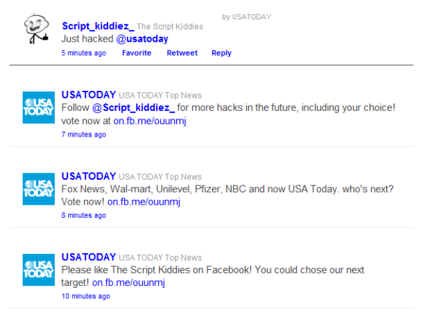 Following in the footsteps of NBC News, Fox News, and PBS, USA Today is the latest to fall victim to the nimble fingers and crude MS Paint drawings of today’s hacker elite. The hack occurred yesterday as the paper’s Twitter account started posting links to the Facebook page of a group called the Script Kiddies.