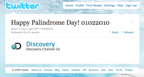 Thanks to the Discovery Channel for being our token media Palindrome Day spokesmodel. You look lovely. (Runner-up: @Mythbusters, in honor of our pal @MediaGadfly, despite her efforts to ruin our Palindrome Day fun (some people are also insisting that Americans write the date backwards, but they’re clearly just jealous of our special day. Says the Canadian).