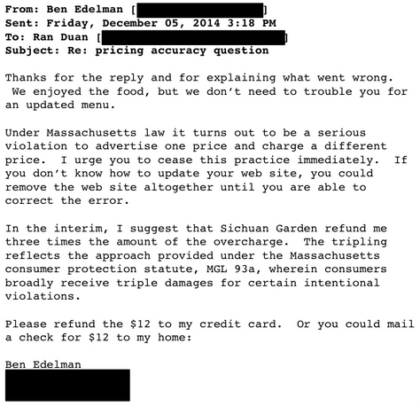 Boston.com obtained the email exchange between Professor Ben Edelman and Ran Duan. Duan manages the Baldwin Bar located inside the Woburn-based Sichuan Garden. Edelman asked Duan about the price discrepancy, and Duan said they hadn’t updated the prices online. Here’s how Edelman responded: