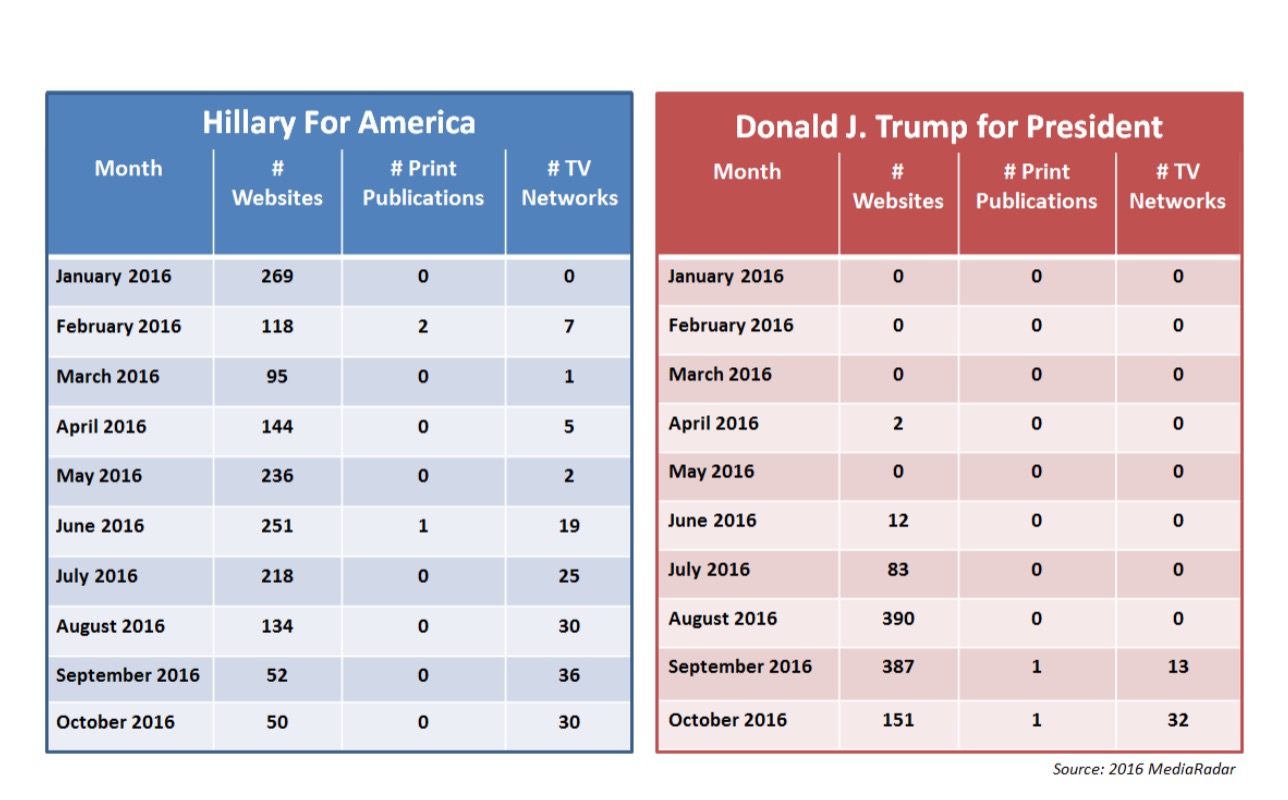 In a last campaign rush, both candidates concentrated on penetrating TV for October. Clinton ran ads across 36 TV networks to Trump’s 30 TV networks according to MediaRadar. Both candidates are casting a wide net, hoping to pull voters across the 18-50 age demographic.