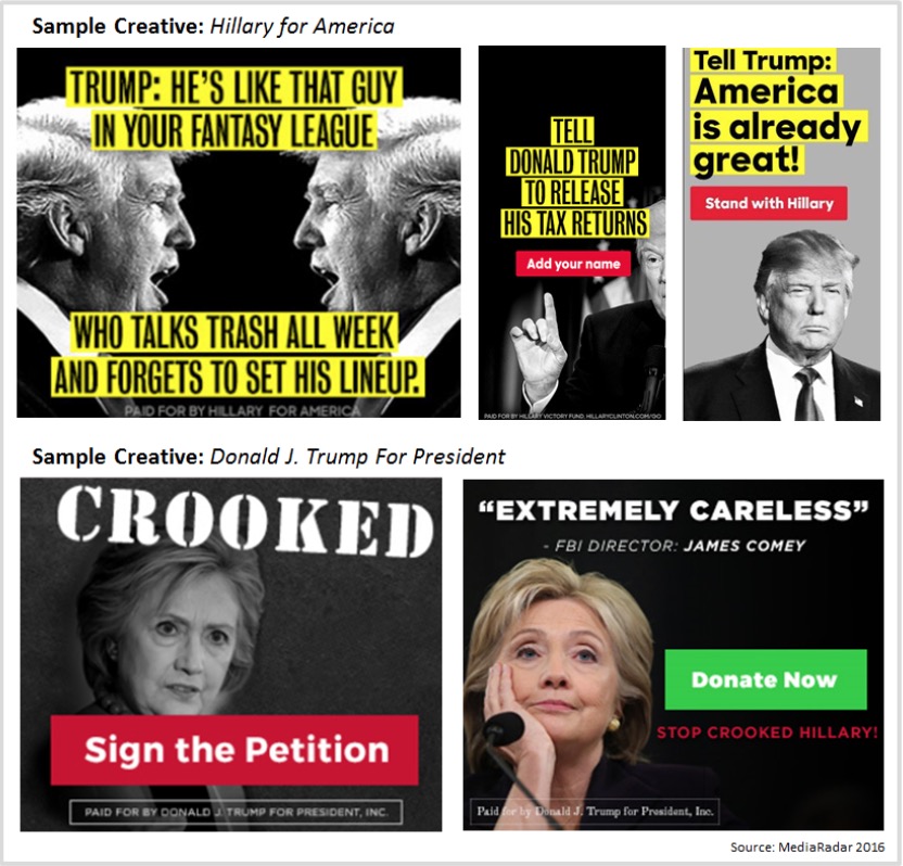 Trash talking has become the norm. Political messaging has been very hostile and personal. Hillary Clinton’s forceful taglines read: “Trump: He’s Like That Guy in your Fantasy League who Talks Trash all Week and Forgets to set his Lineup,” “Tell Trump He’s Not Fit to be Commander-in-Chief,” and “Tell Donald Trump to Release His Tax Returns.” Some ads even infer that Trump is a Putin puppet.