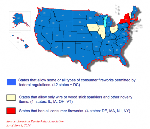 As anyone who lives in the New York/New Jersey metropolitan area knows, the smuggling of fireworks from neighboring states (mostly Pennsylvania) is a common thing to do the week of Independence Day. But those two states aren’t the only ones that prohibit the sale of consumer fireworks.