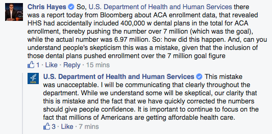 In a Facebook Q&A with MSBNC host Chris Hayes Thursday, Health and Human Services Director Sylvia Burwell called the erroneous conflation of dental sign-ups with Obamacare enrollments last spring “unacceptable.” The inclusion of over 300,000 dental sign-ups pushed the enrollment number over the 7 million projected goal, hailed at the time as a triumph of the program.