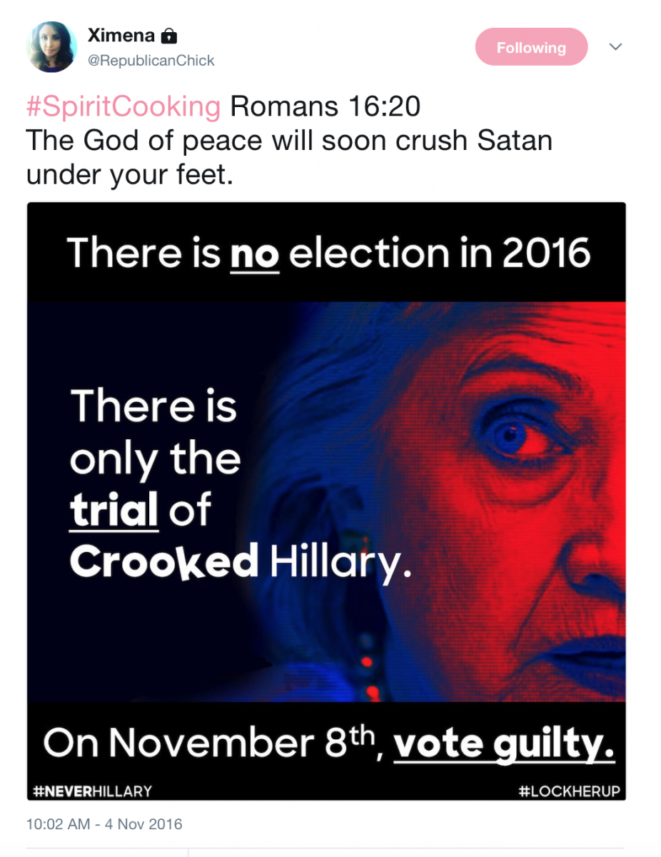 “#SpiritCooking Romans 16:20 The God of peace will soon crush Satan under your feet,” tweeted the HHS official, alongside a meme that read, “There is no election in 2016. There is only the trial of Crooked Hillary. On November 8th, vote guilty.”