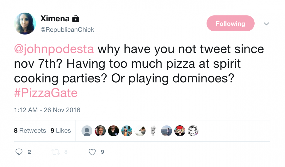 “@johnpodesta why have you not tweet since nov 7th? Having too much pizza at spirit cooking parties? Or playing dominoes? #PizzaGate,” Barreto tweeted in late November 2016.