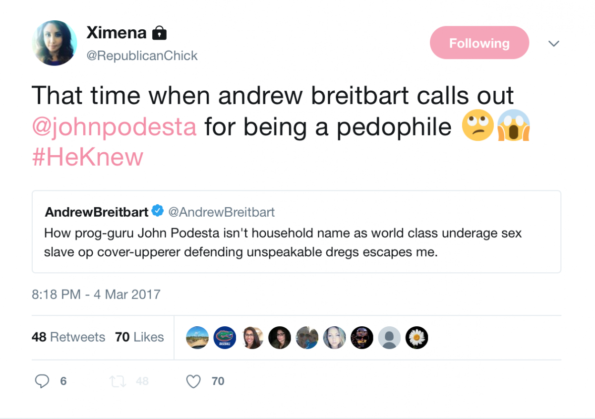 She continued this claim in other tweets, writing that “@AndrewBreitbart definitely knew of #PizzaGate before passing!” and quote tweeting an old Breitbart tweet with just the hashtag “#Pizzagate.”‘