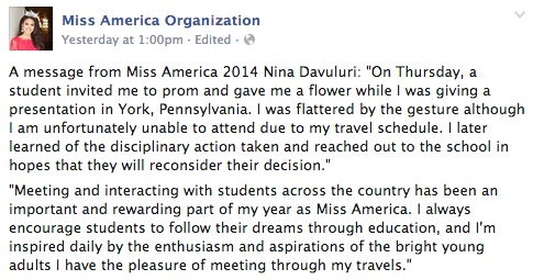 Davuluri, however, posted to the official Miss America Facebook page about the incident and said that the school should reconsider such a heavy punishment.