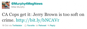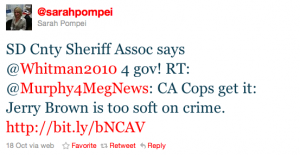 Ah, the importance of one little letter. A couple of days ago, the Deputy Sheriffs’ Association of San Diego County endorsed Meg Whitman, something her senior consultant, Mike Murphy, tweeted out. Whitman’s press secretary, Sarah Pompei, then retweeted Murphy, however, she accidentally cut off one letter from the URL. So, instead of sending Twitter followers to a blog post about the endorsement, she sent them to a video of…something else.