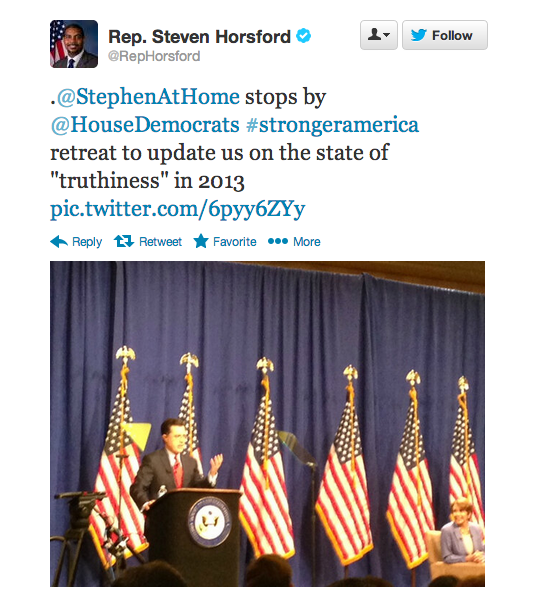 As we announced yesterday, Stephen Colbert appeared as the “surprise guest” at the House Democrats’ annual retreat this morning in Leesburg, Virginia. The event was officially “closed” to the press, but that didn’t stop Democratic lawmakers in the room from tweeting updates, jokes and photos as they happened.