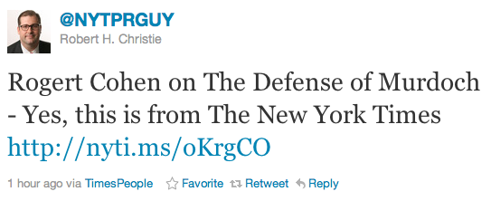 But I thought The New York Times was was supposed to be a home for Fox-hating, socialist, elites. Not Murdoch-defending, elitist-insulting, capitalists. Hilariously, Robert H. Christie, Senior Vice President, ofCorporate Communications for The New York Times Company played with the seeming disconnect in his promotion of the piece.