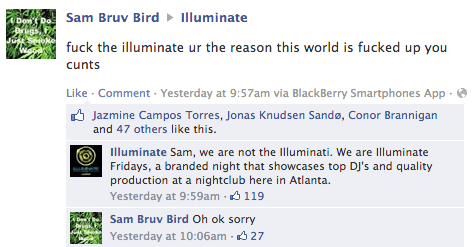 The Illuminati conspiracy is obviously real, why else would people be constantly talking about the Illuminati conspiracy? And one intrepid individual decided to go right to the source of the mysterious conspiracy’s power: Facebook. There’s just one problem. See, he tried to post a message about how the Illuminati c*nts are “the reason this world is fucked up,” but alas, it didn’t go to the right people. He ended up posting on the page of a nightclub called Illuminate instead.